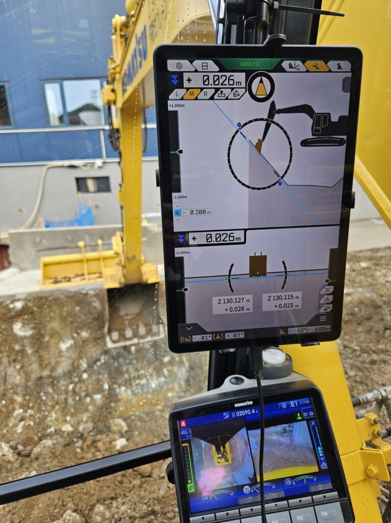 電子基準点を固定局、ICT建設機械PC128US-11(3DMG)を移動局としてdocomo IoT高精度GNSS位置情報サービスで位置補正をして数cm級の精度で施工しています。