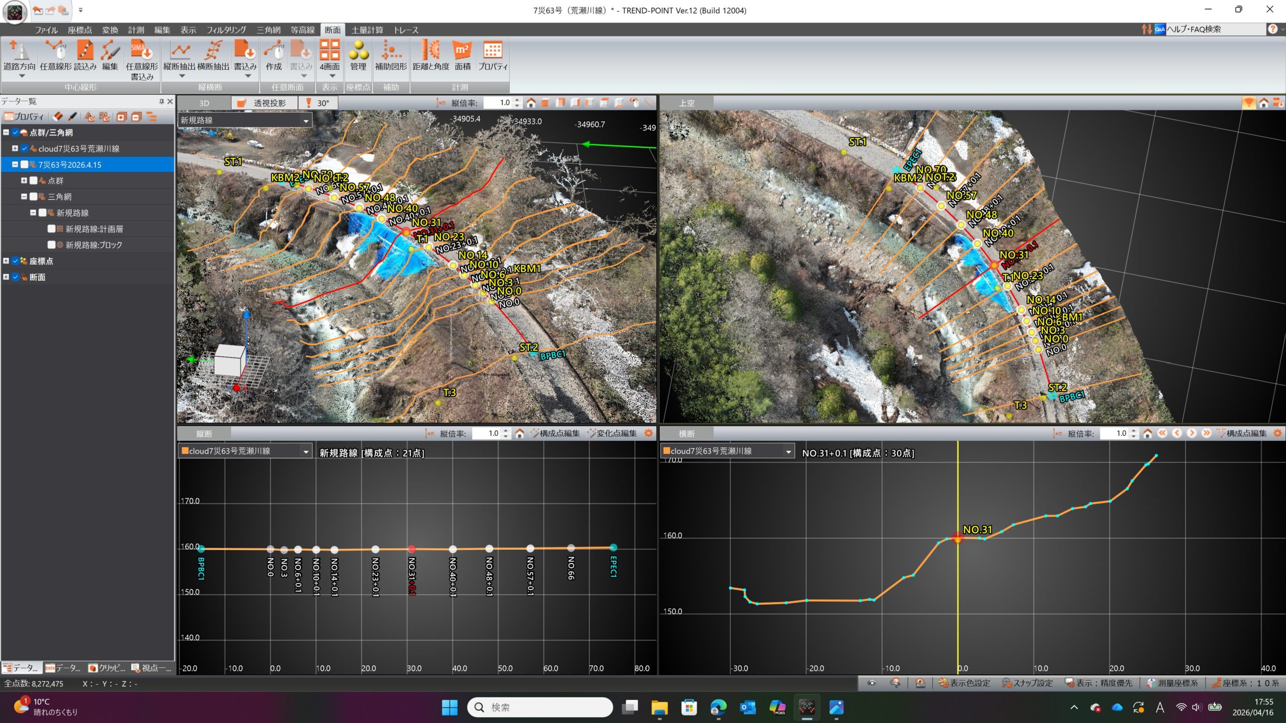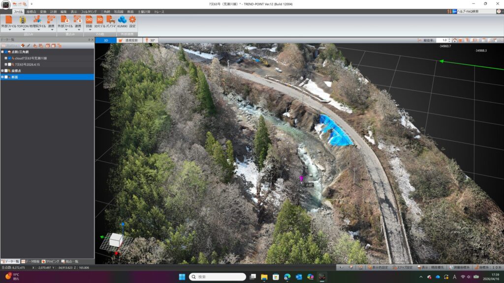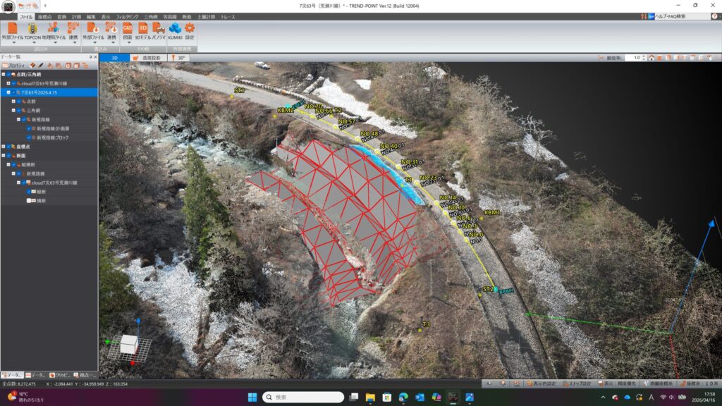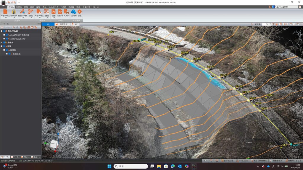 現況測量(縦横断作成)事前に中心線線形データを作成していたので縦横断は約5分でできます
